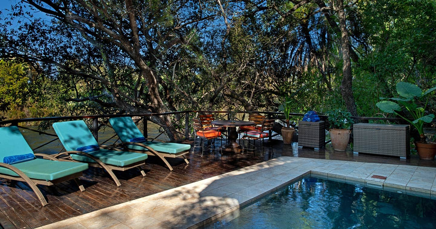 Stone lined sandy pathways lead to the eight well-appointed Meru-style safari tents with private balconies and en-suite facilities that include a large walk-in shower, vanity basin and flush WC. The tents are privately set and shaded by jackalberry trees with canvas walls incorporating gauze windows. Step out to your own private balcony to listen to the rapids, relax on your sumptuous bed and then head to the dining room or bar to share stories with others or soak in river views with a glass of African red wine. This is also where you come to enjoy great food by local chefs. Quiches, soft homemade buns, salads chock full of fresh produce: it is all a real treat for the taste palette. The communal guest areas are perched on wooden platforms raised on stilts above the water. The lounge, bar, library and dining areas are under thatch and open sided. Comfy couches and colourful chairs create a relaxed and homely atmosphere, dinner is enjoyed around the large square dining table and there is a secluded swimming pool on the water’s edge. Here, attention to detail is paramount.
